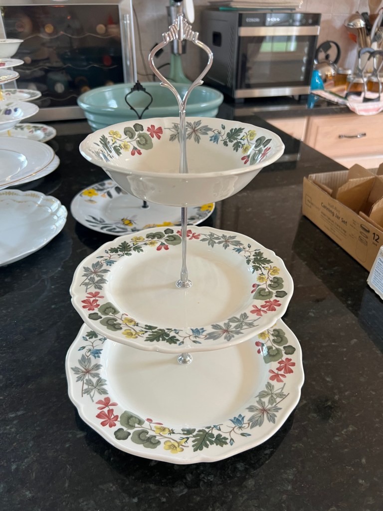 2 or 3 tiered tea plates. 2 tier $20 3 tier $25 Limited quantity available. Each unique, most are made from repurposed china. Picture on right is Wedgewood china that was saved from the landfill. Great for the holidays or that special tea party.