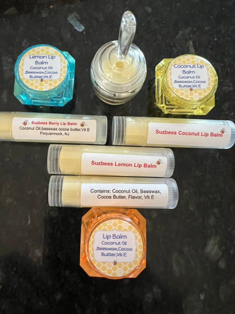 All natural lip balm made from pure beeswax from our hives. $3 jewels or honeypot $4 stick.