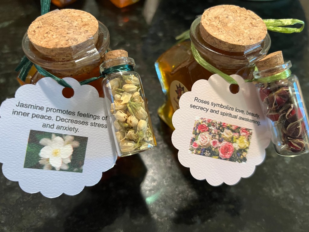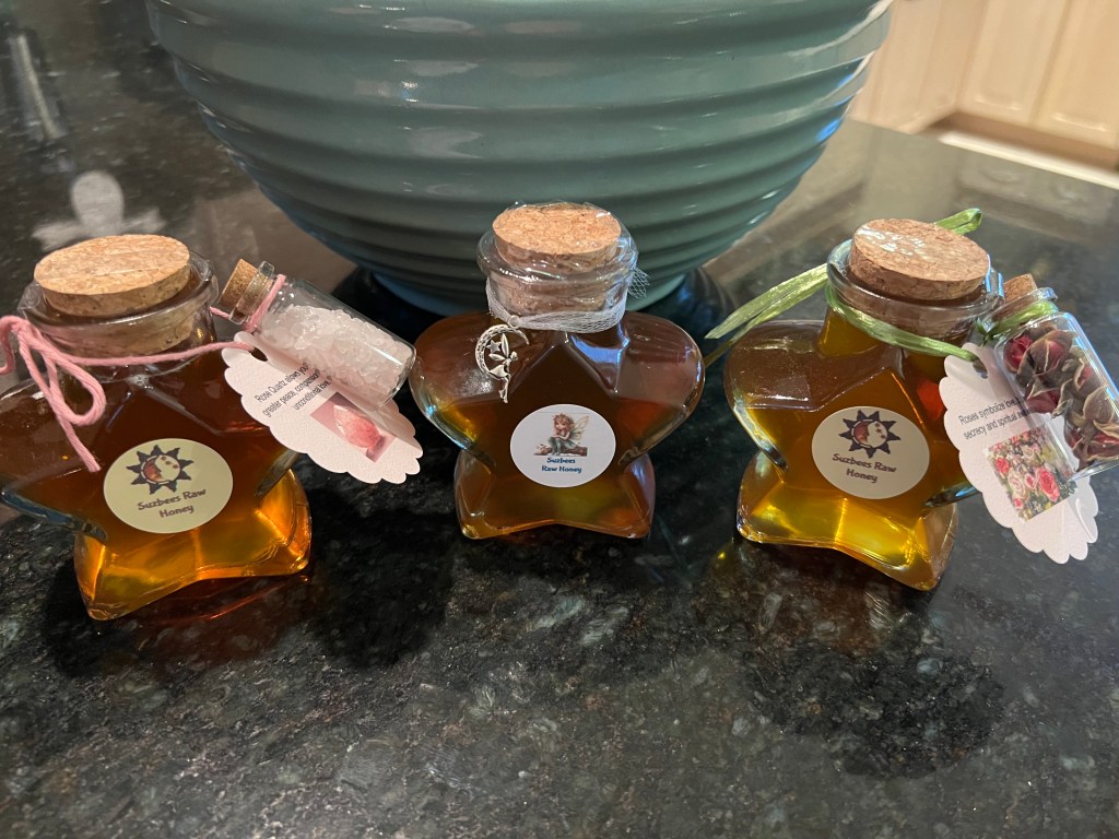 Star shaped honey jars with fairy charm or crystal charms. Certain flowers and crystals promote peace and wellness. Limited quantity available. Share the gift of perfect sweetness and inner harmony. $15