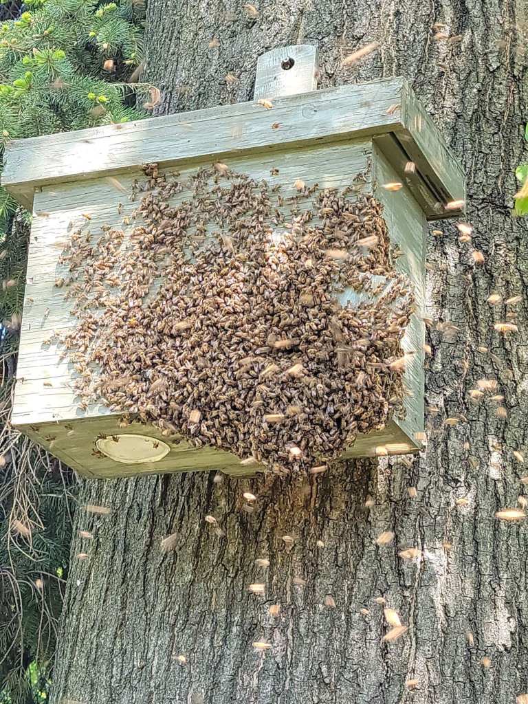 Look out for bees swarming in April and May. If you encounter a honey bee swarm contact your local beekeeper to remove them safely. We will respond locally to swarms in order to safely relocate these bees. Swarms occur when the hive outgrows their current home and are a natural occurrence. Please do not call an exterminator for a swarm of honeybees. Please use the contact us page if you need assistance with a swarm.