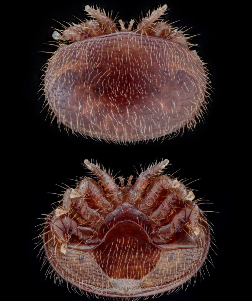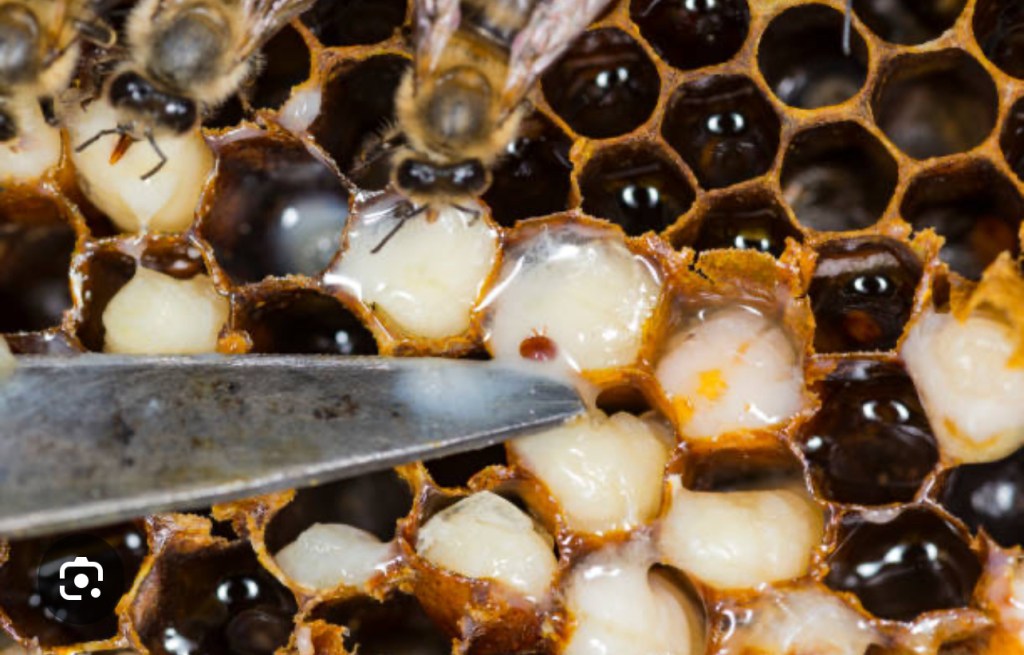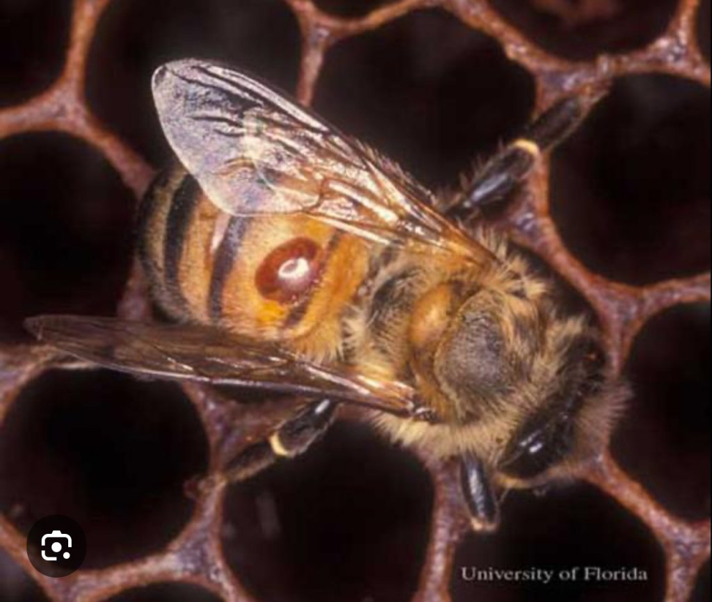This image shows a varroa mite that is invading the larva of the honey bee. Once the bee hatches the mite attaches itself to the bee as shown in the picture below. The mite can carry viruses including deformed wing virus and varroa destructor virus.